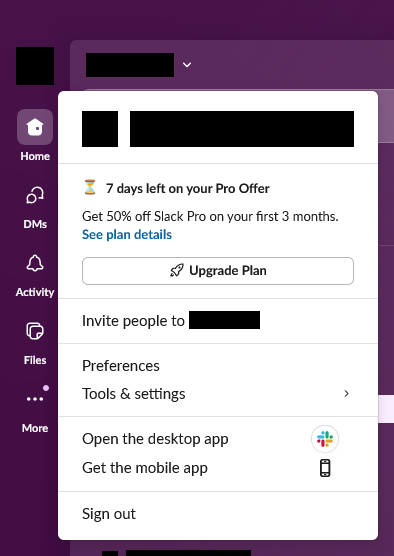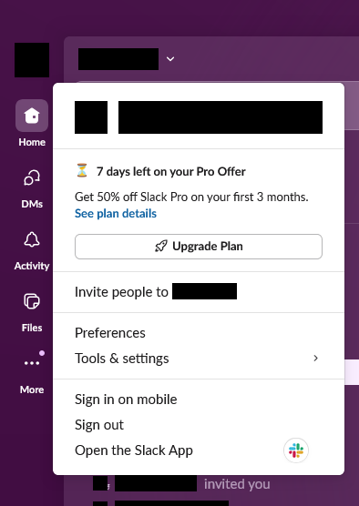 The “Sign in on mobile” option. (This image I produced by modifying Slack [keep reading] on the same workspace as above, so that I wouldn’t have to share a screenshot of a real workspace. If there are any inaccuracies with real Slack, then whoops.)