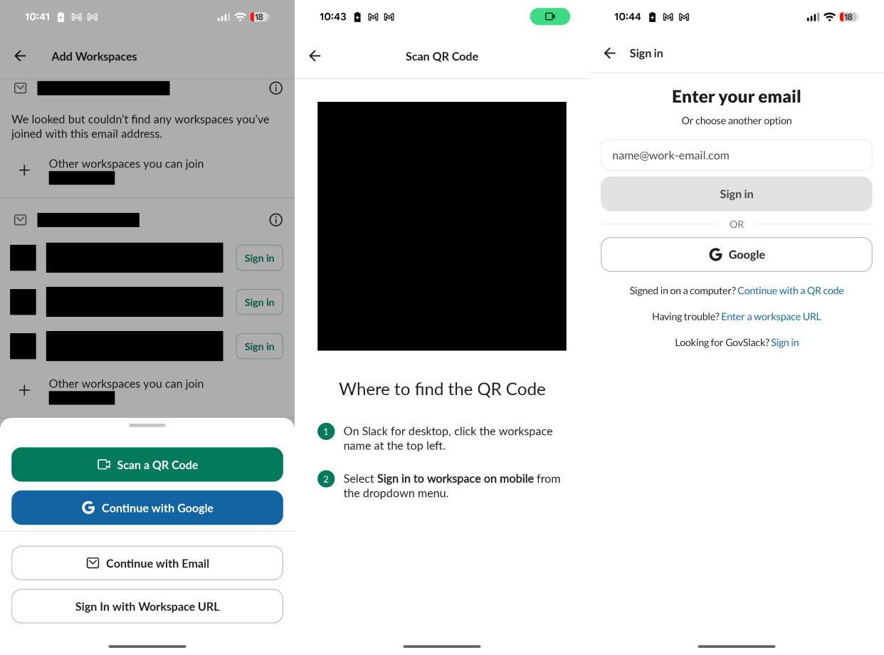 (This support exchange took place in January 2026.) (“Get the mobile app” actually displays a QR code too, but it’s only a link to the app; scanning it with Slack’s sign in flow yields “Something went wrong. Please try again!”) (Trying again does not make scanning the wrong kind of QR code work.)